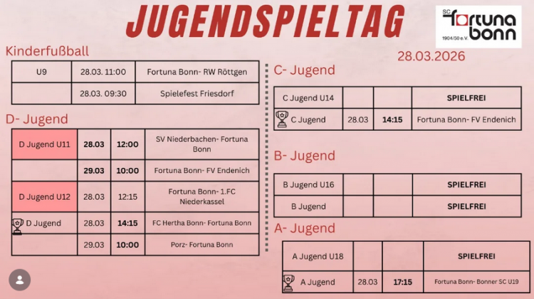 Ähnliches gilt für unsere D-Junioren gegen Hertha Bonn. Auch hier trifft man auf einen Gegner aus der gleichen Liga, wie der Gegner der vorangegangenen Pokalpartie – allerdings auf den aktuellen Tabellenführer dieser Liga. Zusätzlich ist es ein echtes Derby und der Heimvorteil des Gegners erschwert die Aufgabe, sodass eine geschlossene Mannschaftsleistung gefragt sein wird.